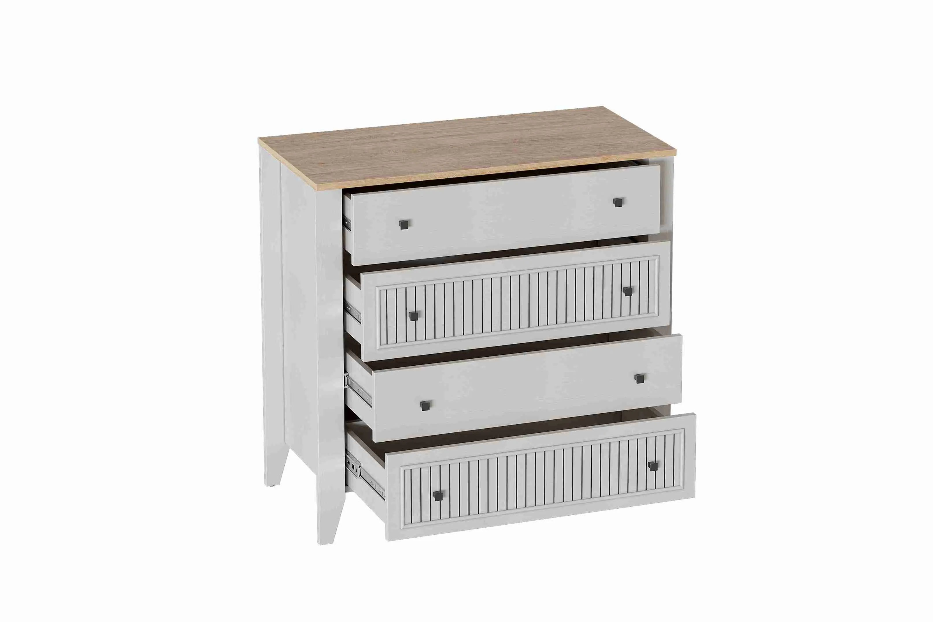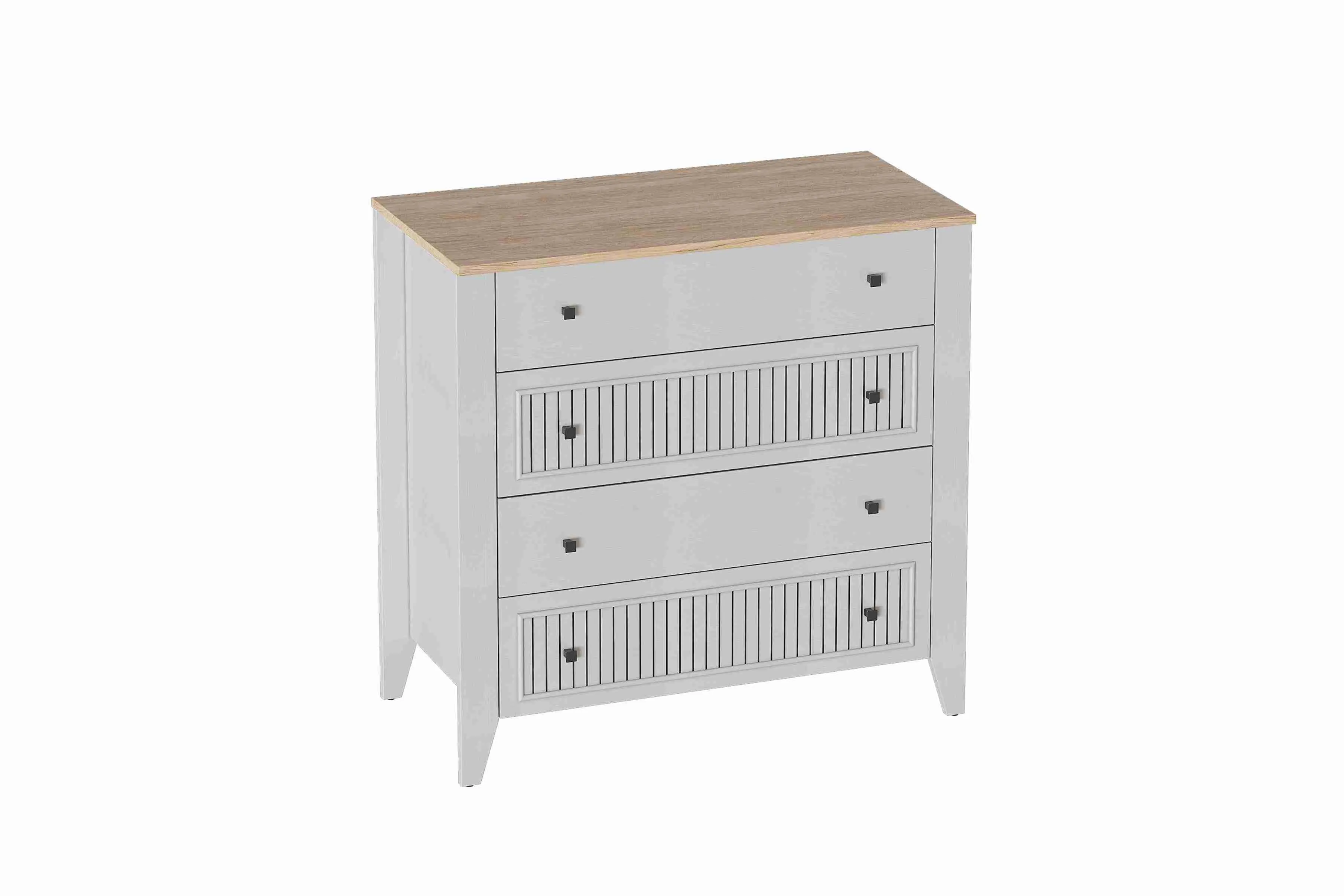 Комод с 4 ящиками Валенсия выполнен из (ЛДСП) в комбинации Дуб натуральный светлый / Персидский жемчуг.