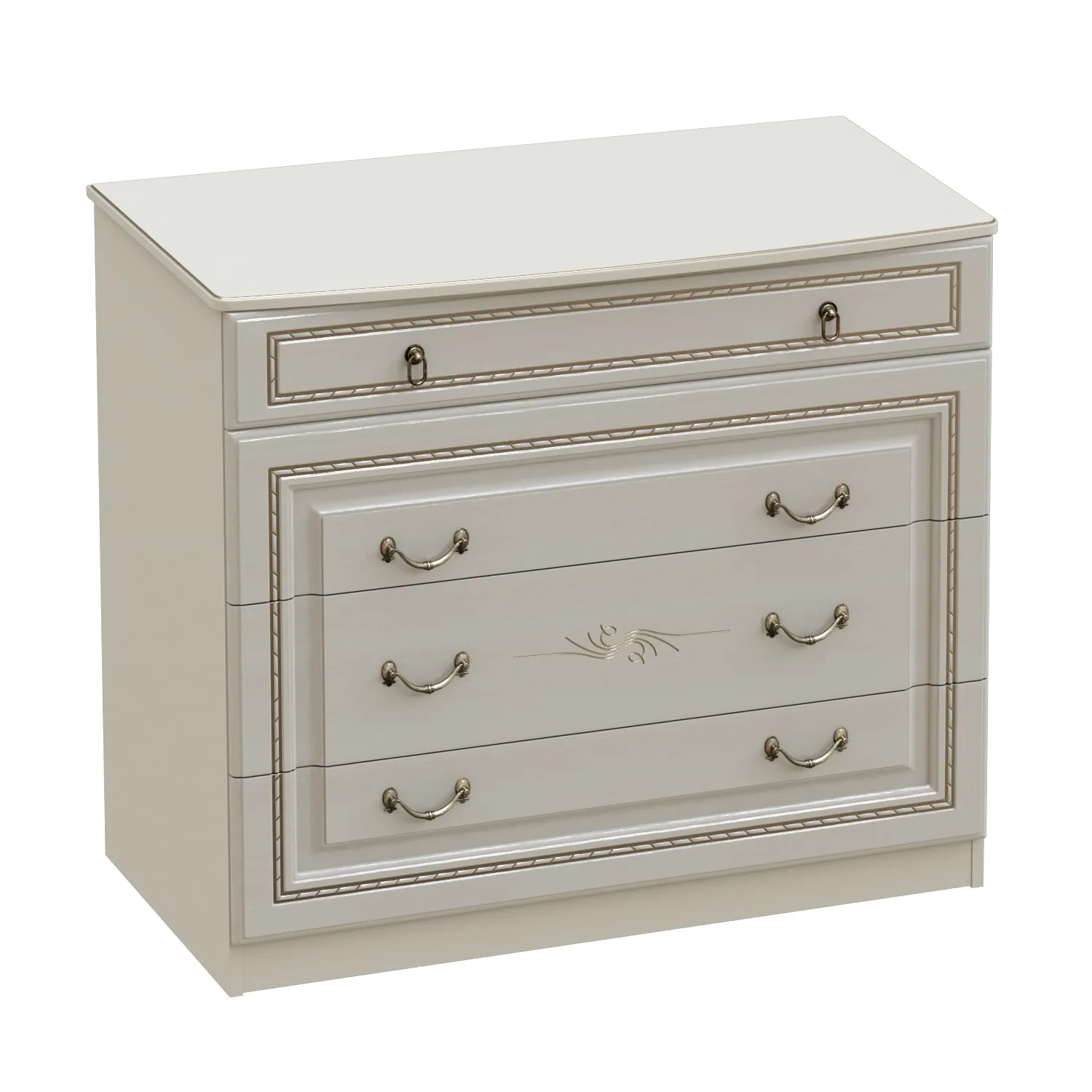 Он отличается роскошным внешним видом и наличием четырех вместительных ящиков. Фасады ящиков декорированы элегантной фрезеровкой с эффектом патины. Для удобства использования ящики оснащены металлическими ручками, имитирующими ковку.