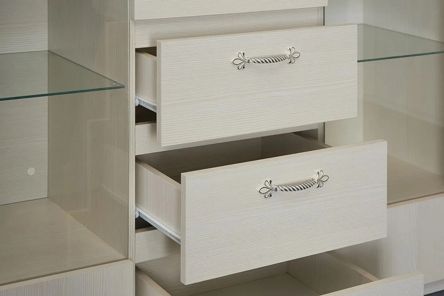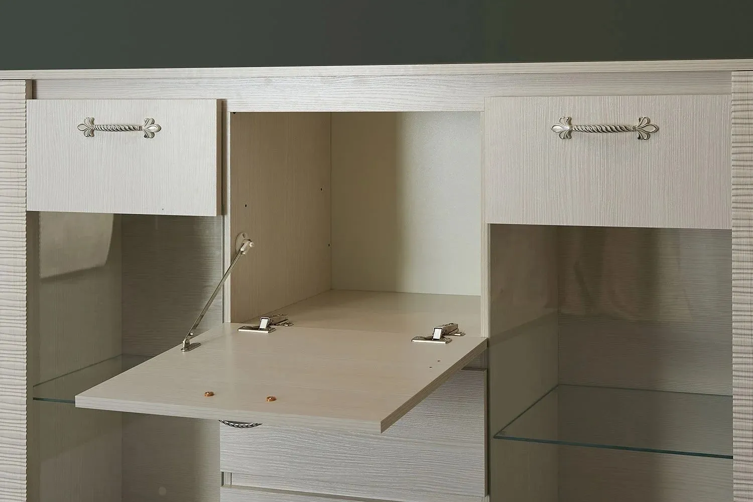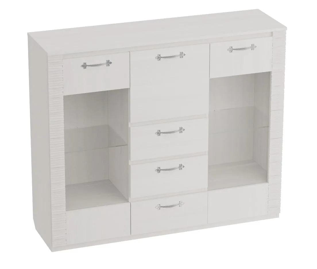 По центру комода располагаются три ящика на роликовых направляющих, над которыми имеется отделение бара закрытое глухой дверцей. Боковые отделения закрыты распашными дверцами со стеклом. Каждое из отделений оснащено двумя стационарными полками и съёмной стеклянной полкой, на которую можно установить светильник.