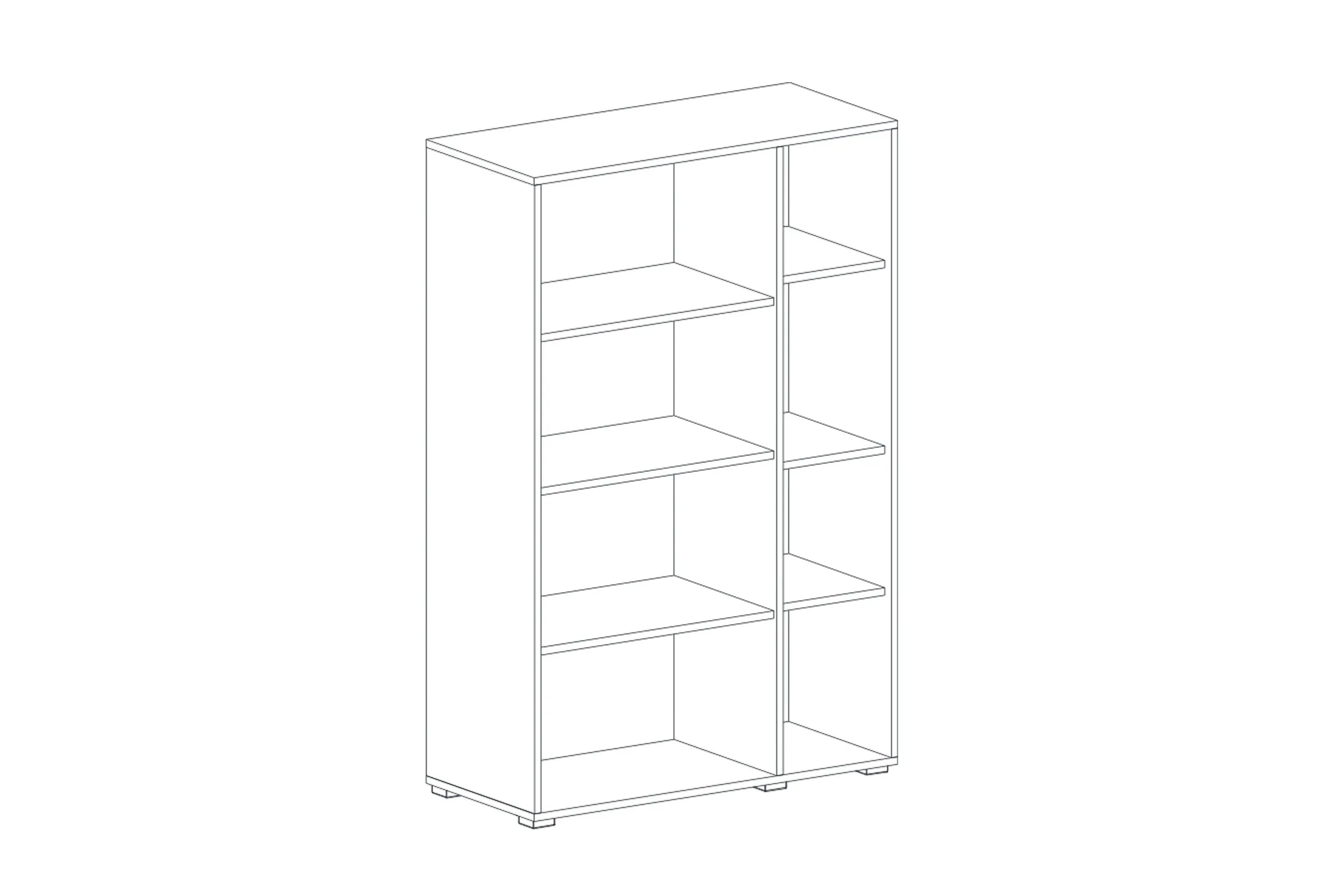 Внутреннее пространство шкафа разделено на два отделения. Левое отделение закрыто дверью со стеклом, за которой располагаются три стационарные полки. Правое отделение закрыто глухой дверью, за которой находятся три съемные полки.