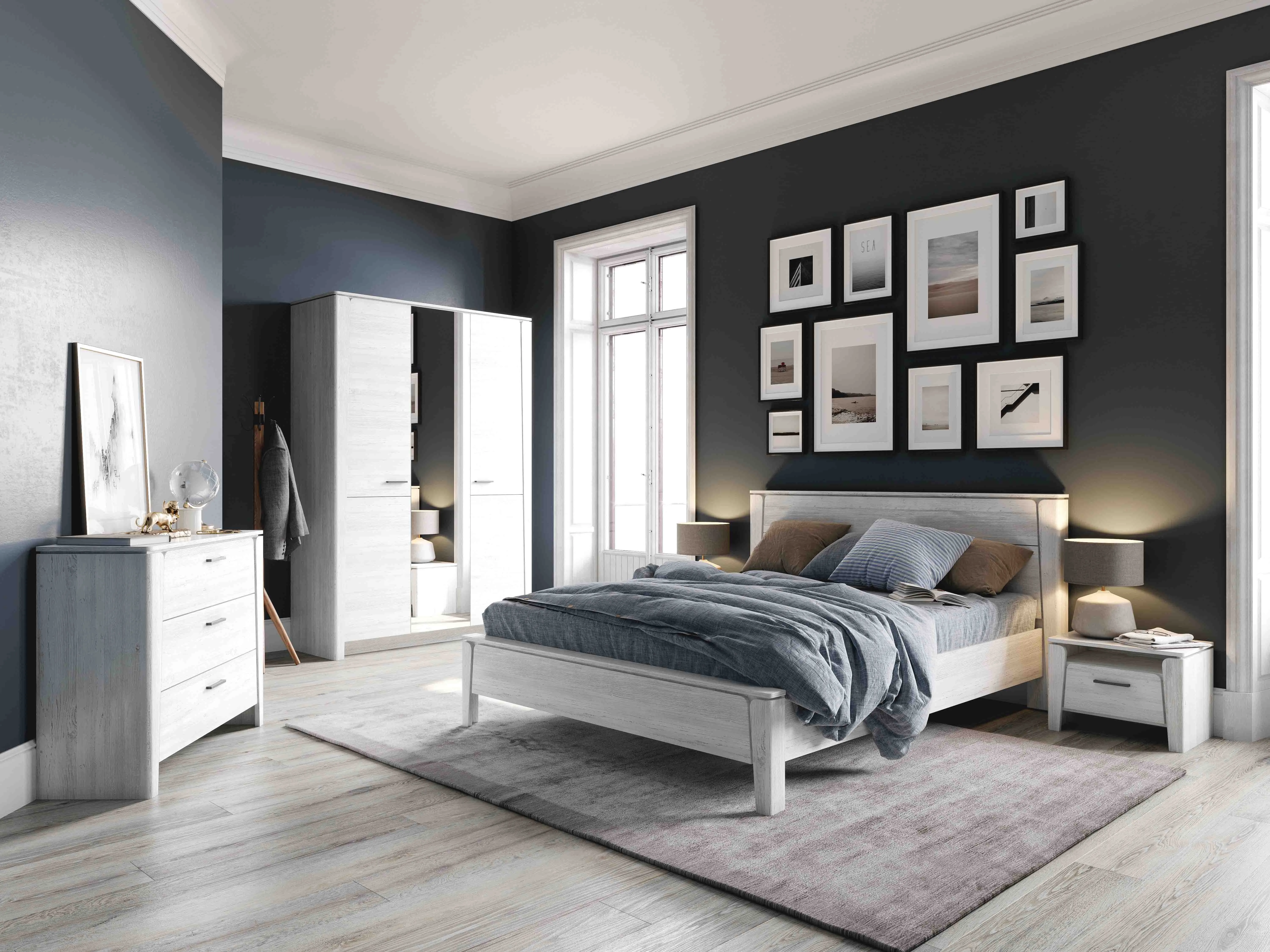 В состав гарнитура входят различные элементы, которые позволят вам создать уютную спальню, такие как: шкаф двухдверный, шкаф трёхдверный, туалетный столик, комод с тремя ящиками, тумба с ящиком, кровать.