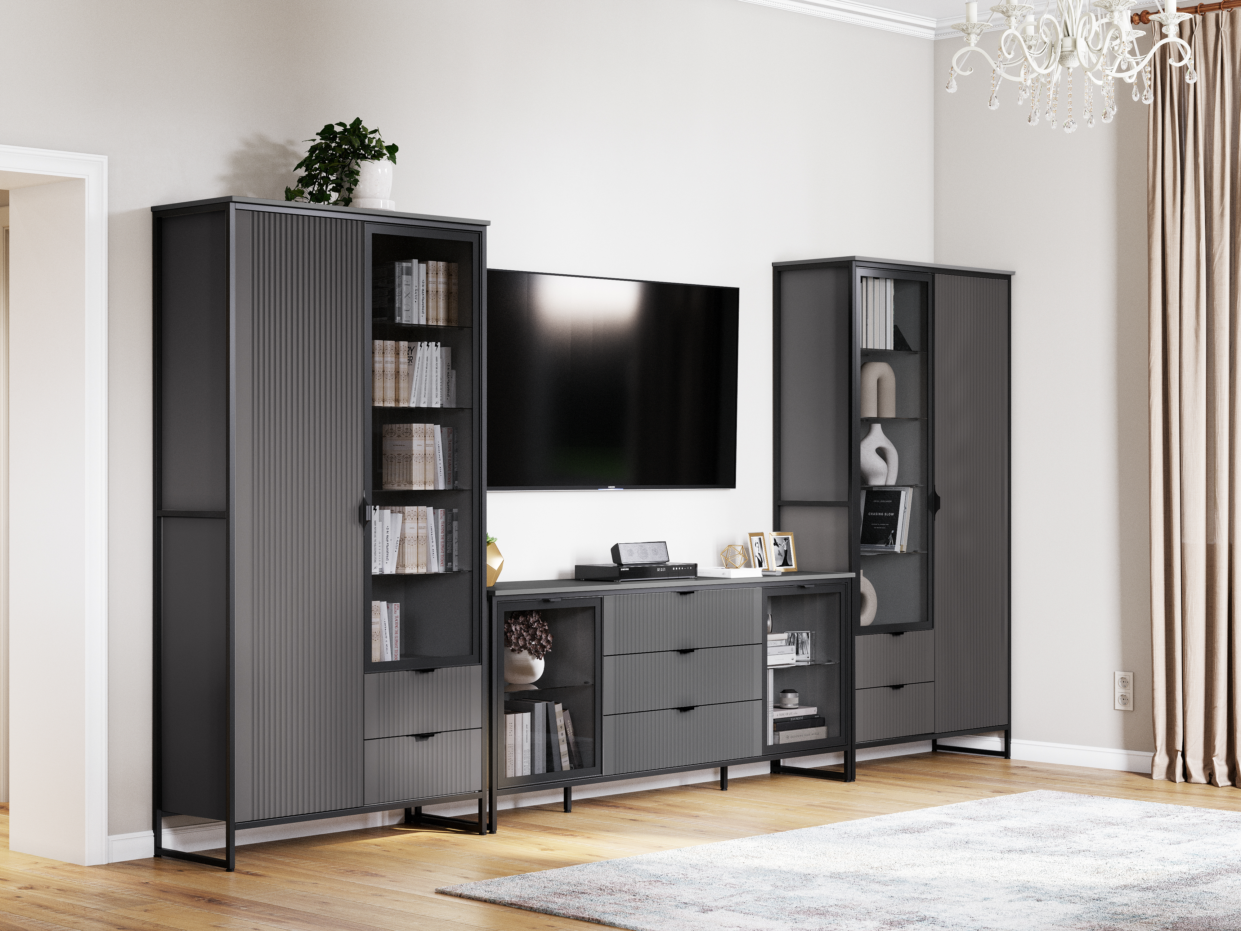 Коллекцию модульной гостиной "Нора" отличает современный оригинальный стиль. Декоративная продольная фрезеровка на фасадах из МДФ и опоры на металлокаркасе цвета соответствуют модным тенденциям этого года в ведущих зарубежных коллекциях.