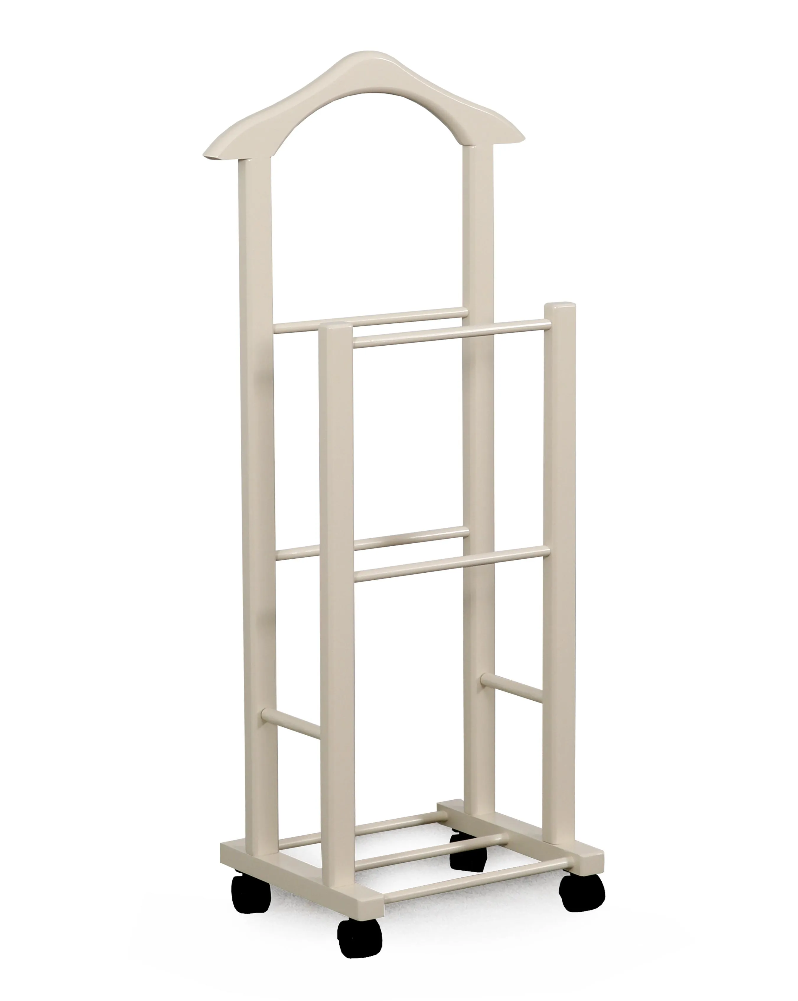Более высокая стойка высотой почти метр и шириной почти полметра имеет закруглённую верхнюю планку. Такая форма удобна для навешивания одежды с рукавами, а габариты вешалки позволяют размещать наряды даже очень крупных пользователей. На нижней планке удобно расположить брюки и юбки.