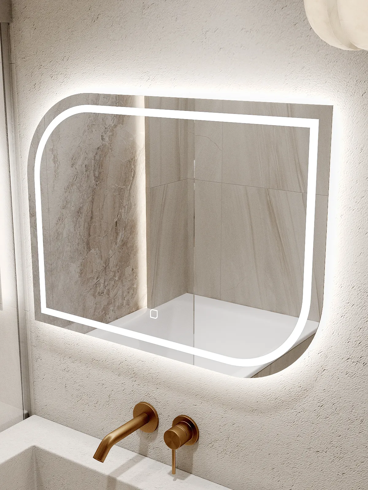 Зеркало оснащено пластинами для крепления к стене и светодиодной лентой с выключателем, срабатывающим от прикосновения. Дюбель-гвоздь покупатель приобретает отдельно, исходя из материала стен.